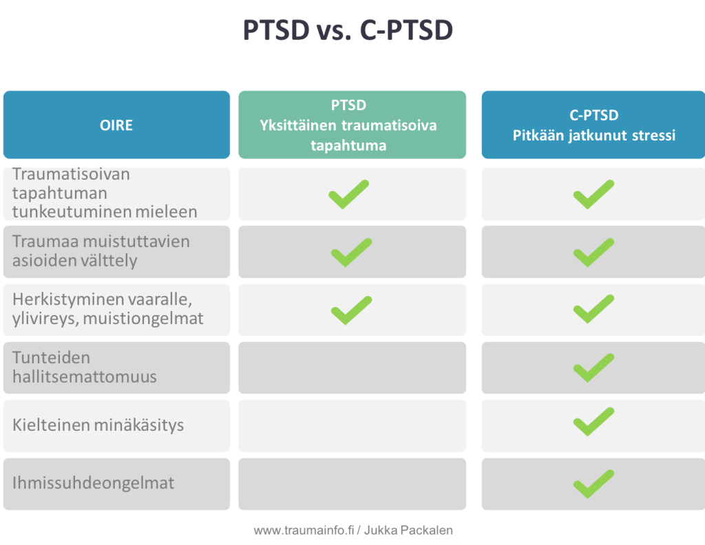 Kaksi viimeksimainittua ovat relevantteja tämän blogin kannalta, erityisesti C-PTSD, ja olen vetänyt niiden oireet yhteen oheiseen taulukkoon.