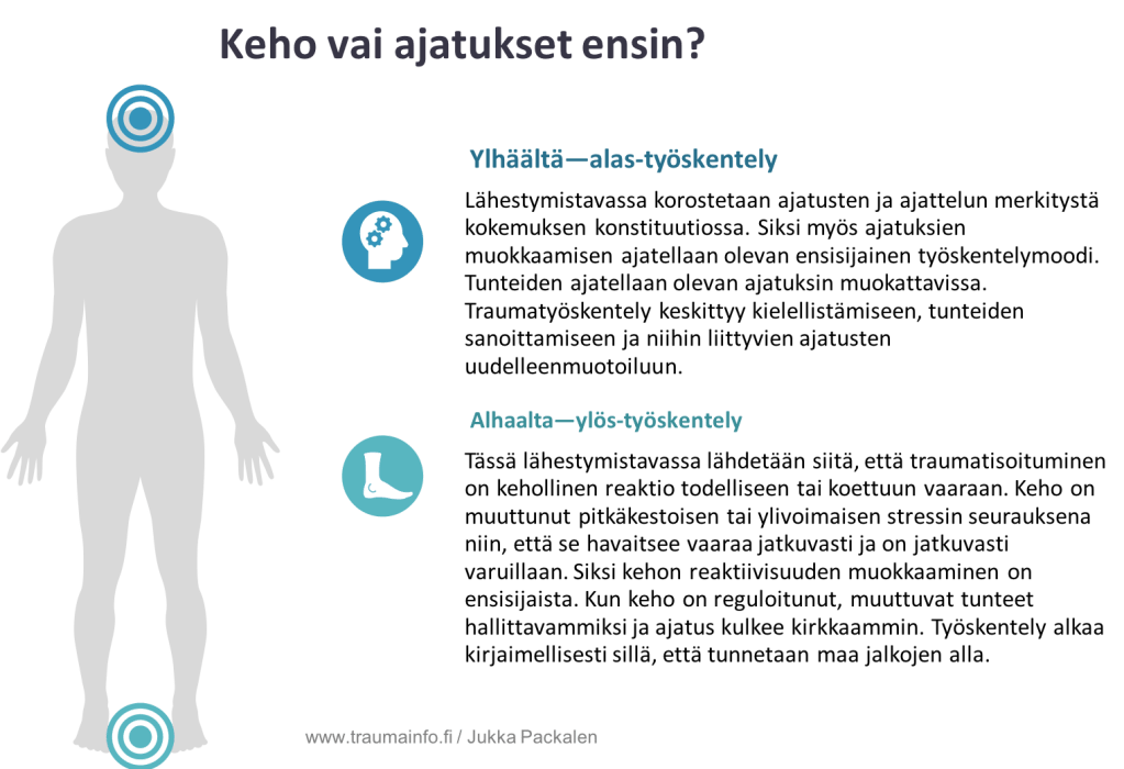 “Kognitiivinen prosessointi” on toissijaista jo siksikin, että trauma-aktivaatioissa keskushermoston toiminnanohjaus (executive functioning), eli suunnitteleva, tulevaisuuteen orientoinut ja reflektoiva ajattelu on useimmiten jonkin asteisesti estynyttä. Se ilmenee vaihdellen desorientaatiosta totaaliseen kyvyttömyyteen mentalisoida traumaperäisen stressireaktion aikana. Nämä stressireaktiot voivat olla aktiivisina valtaosan ajasta, ml. öisen lepotilan aikana. Traumasta eheytymisen tärkeimpiä tekijöitä ovat turvalliset ja pysyvät kiintymyssuhteet ja rakkaus sekä keholliset, somaattisen reguloinnin menetelmät.
